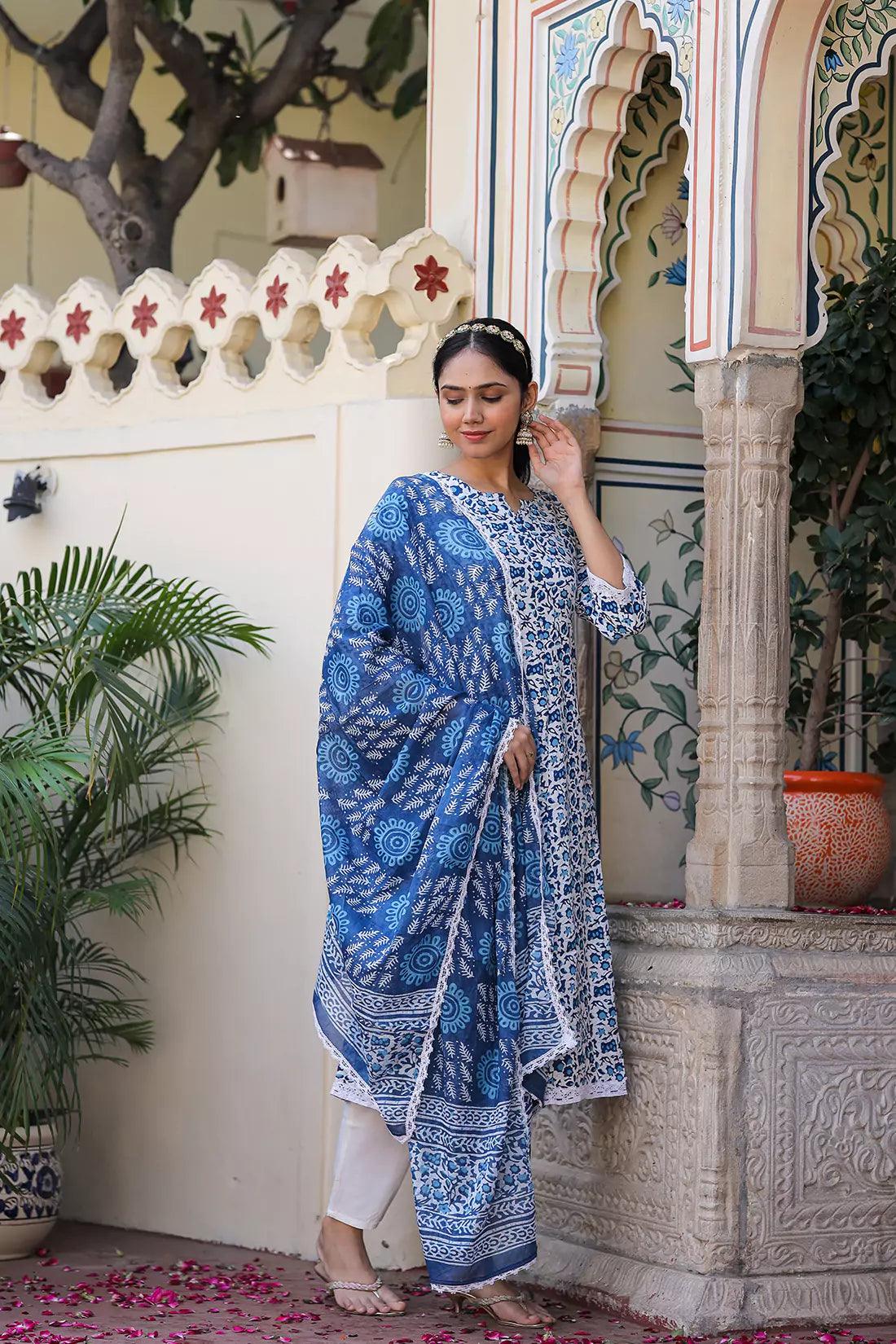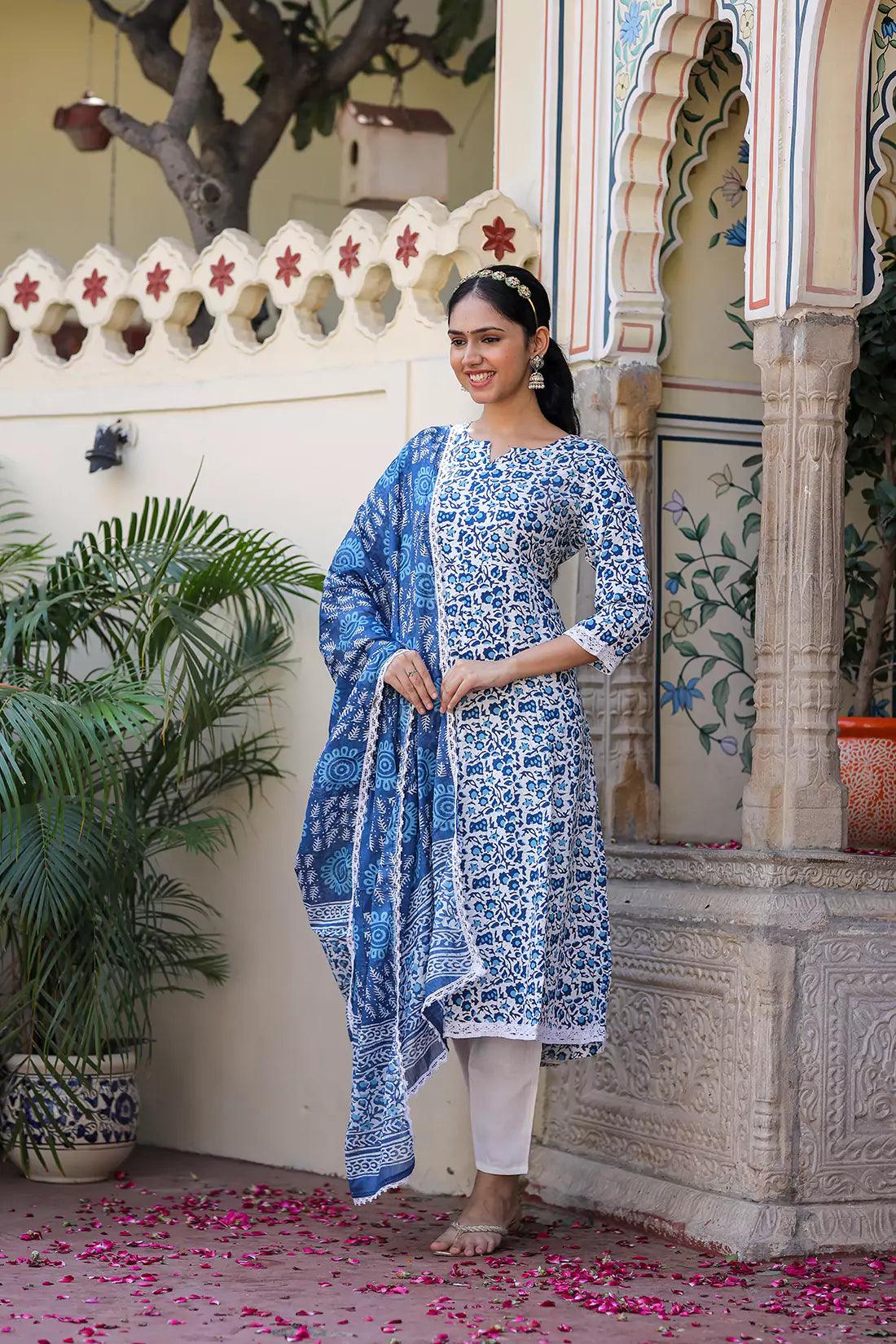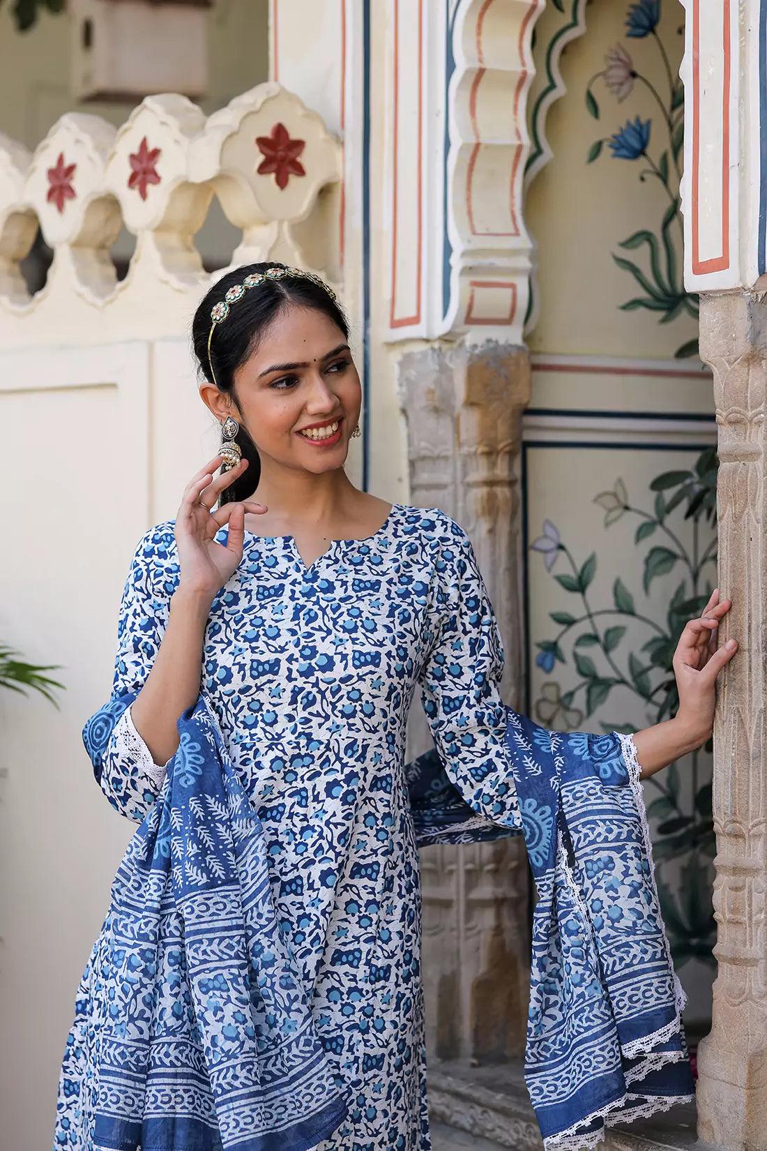 Complete with a contrast white Bottoms and matching dupatta crafted from the same fabric, this adds an extra layer of grace and charm to your attire. The Fabric offers you softness, Comfort, and Confident. The prints of our Kurta set are from Sanganer, well known place for exclusive Printing designs.