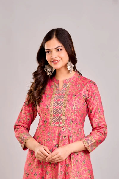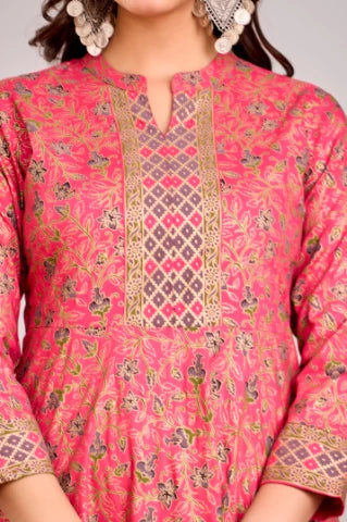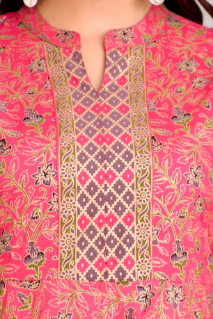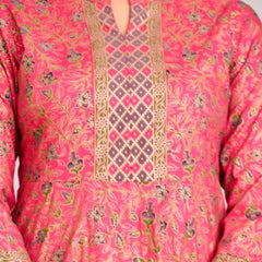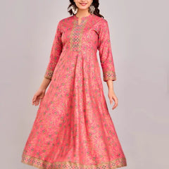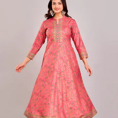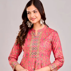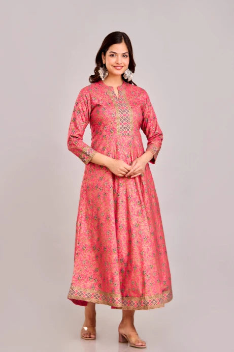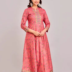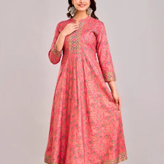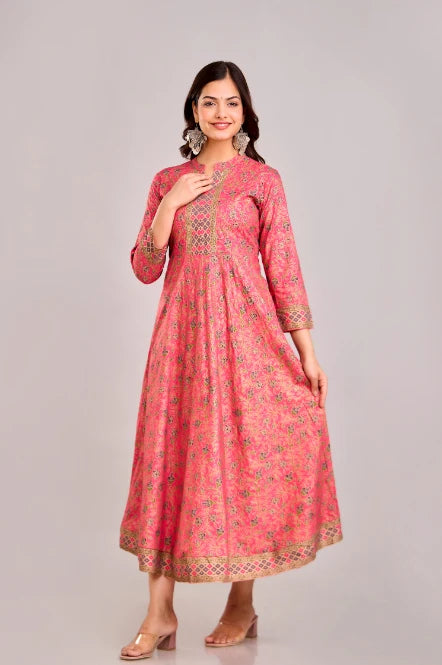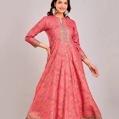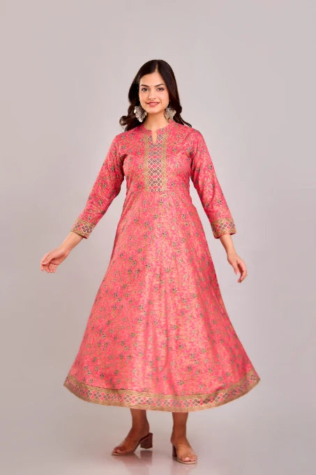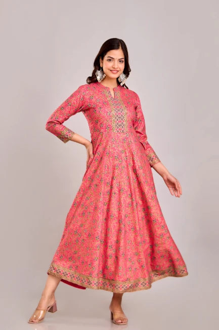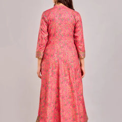 This vibrant peach printed gown boasts a beautiful Anarkali-inspired silhouette, featuring a flattering flared fit that cinches your waist with floral prints and a gracefully flowing skirt that creates a mesmerizing drape. Crafted from viscose rayon, this gown is perfect for all-day comfort and effortless elegance.