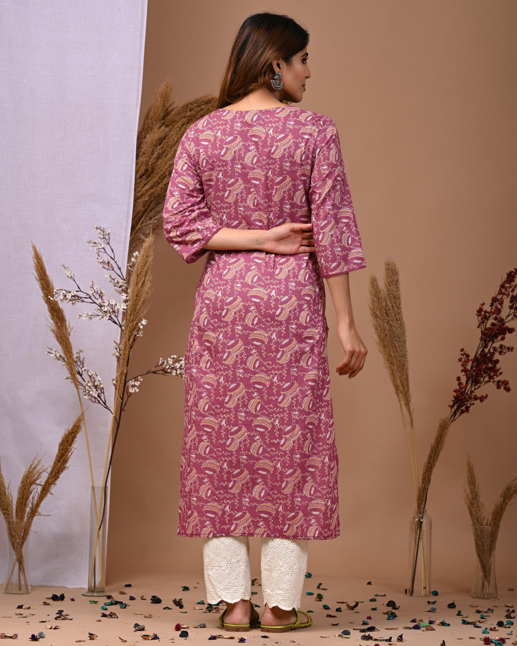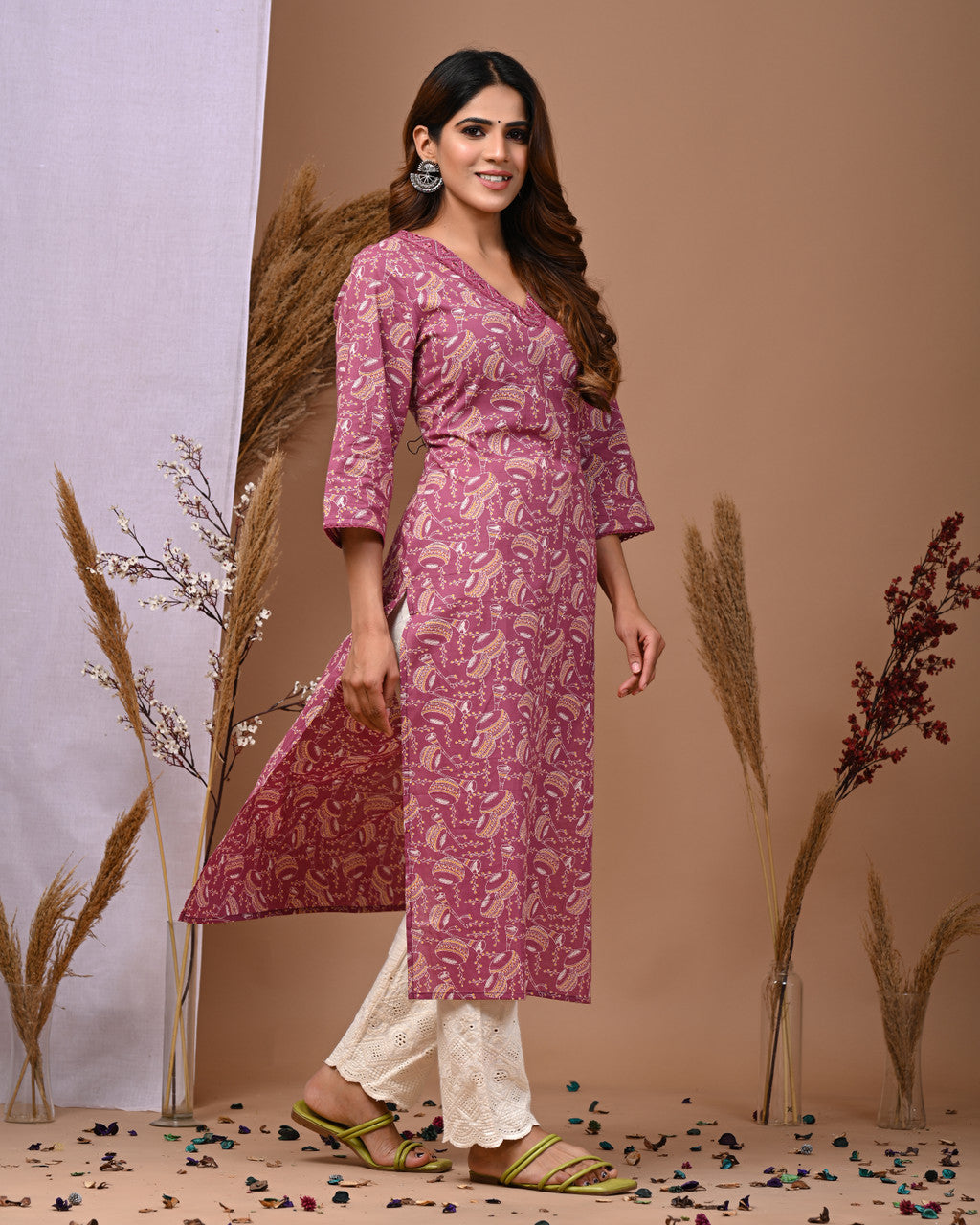 Pink Floral Printed Rayon Straight Kurta with V-Neck & 3/4th Sleeves