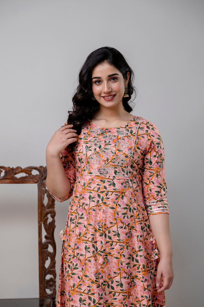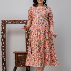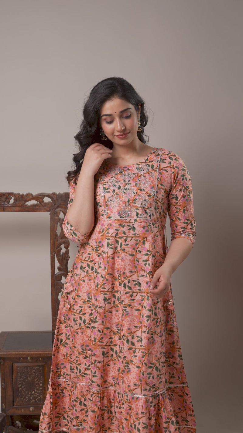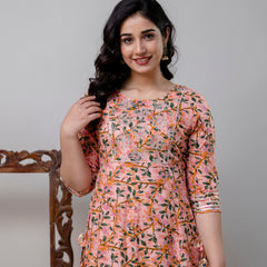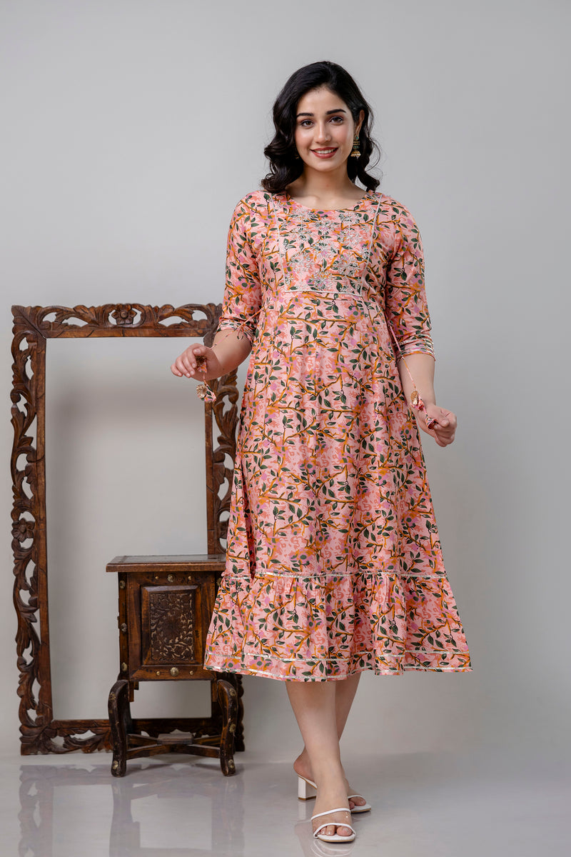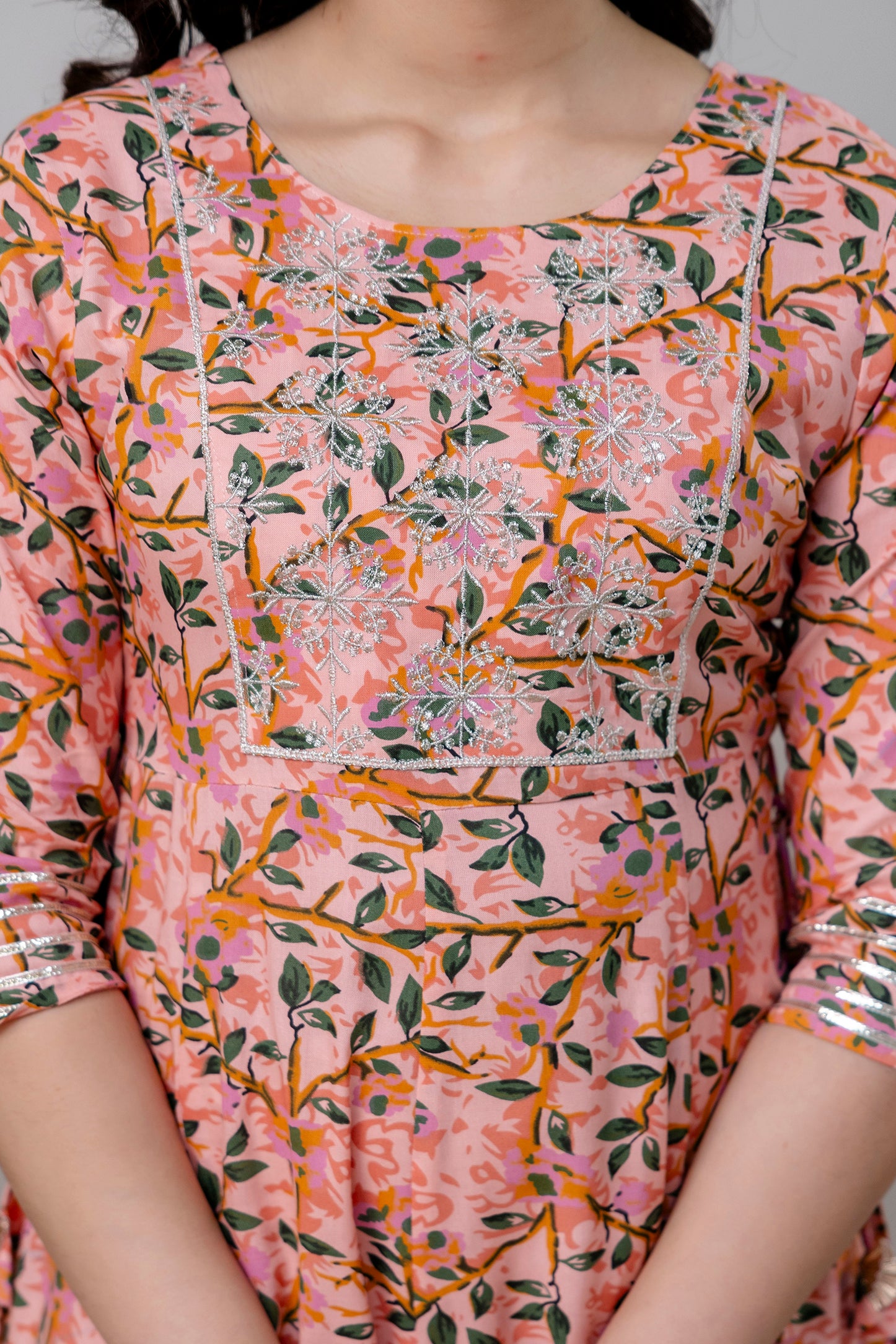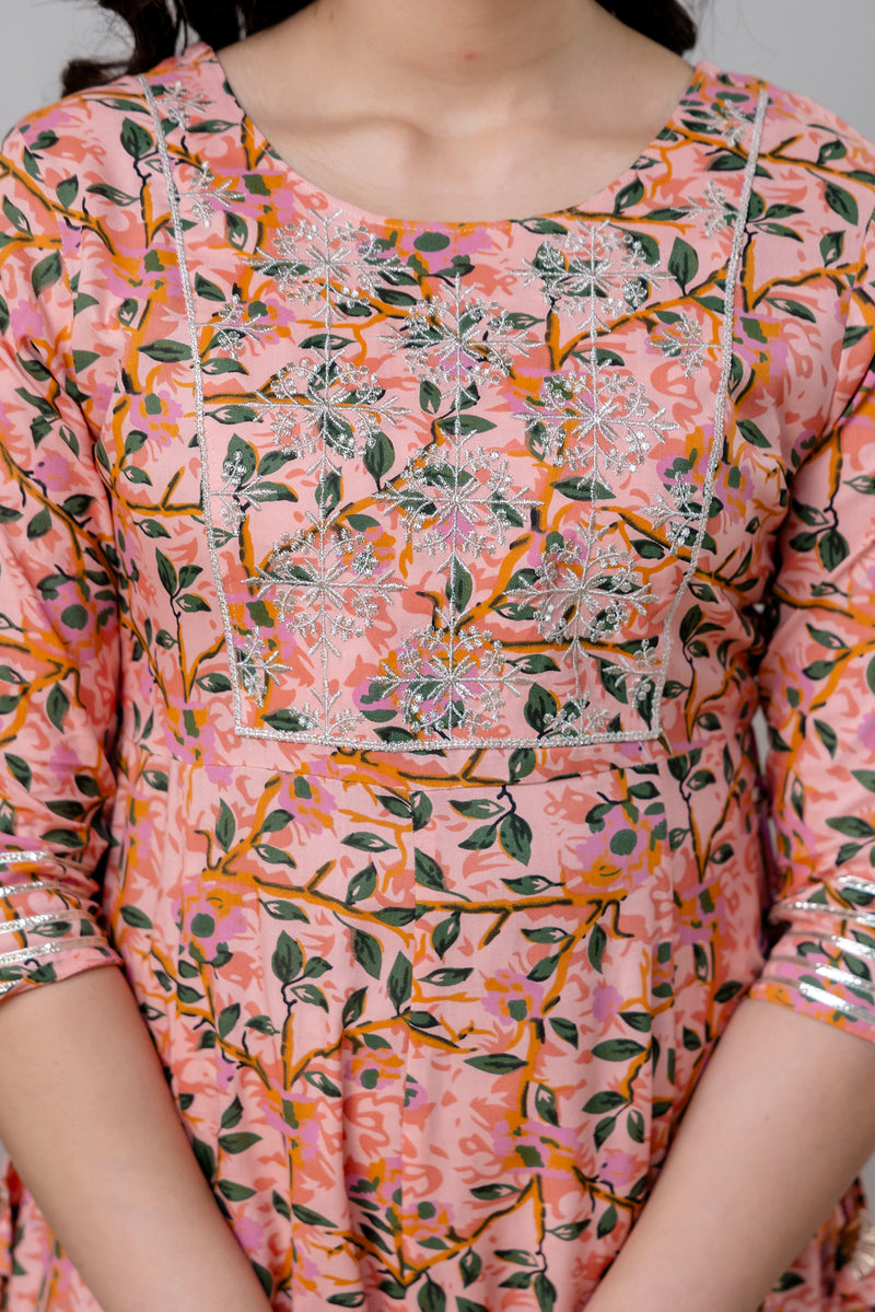 Step into timeless elegance with this Ethnic Motifs Printed Anarkali Kurta, adorned with delicate floral patterns and intricate mirror work. Designed with flared sleeves for a graceful silhouette and crafted from lightweight, breathable fabric, it offers both comfort and festive flair. Whether you're attending a celebration or embracing everyday grace, this kurta blends tradition and trend effortlessly.