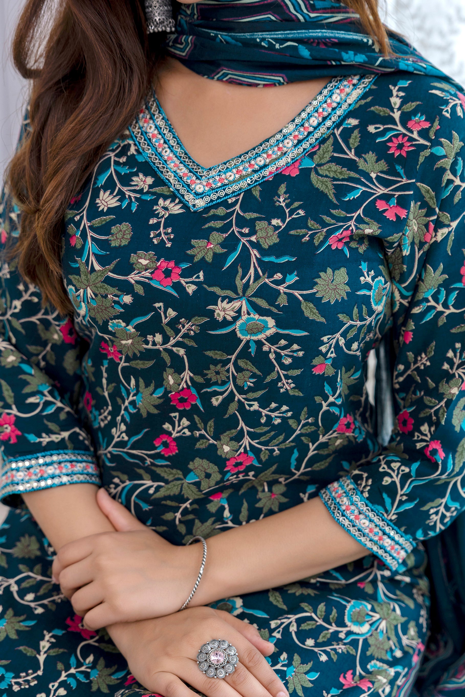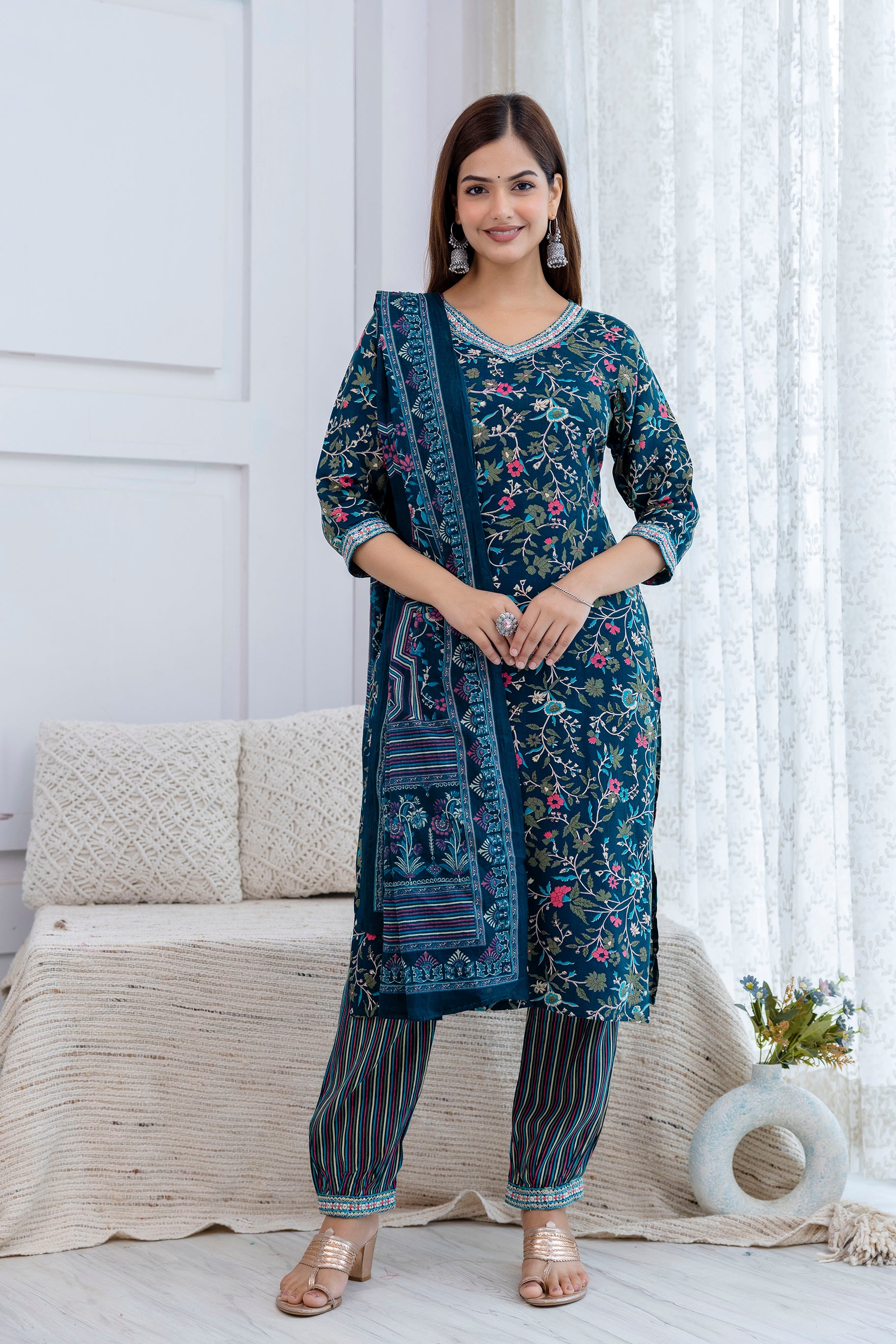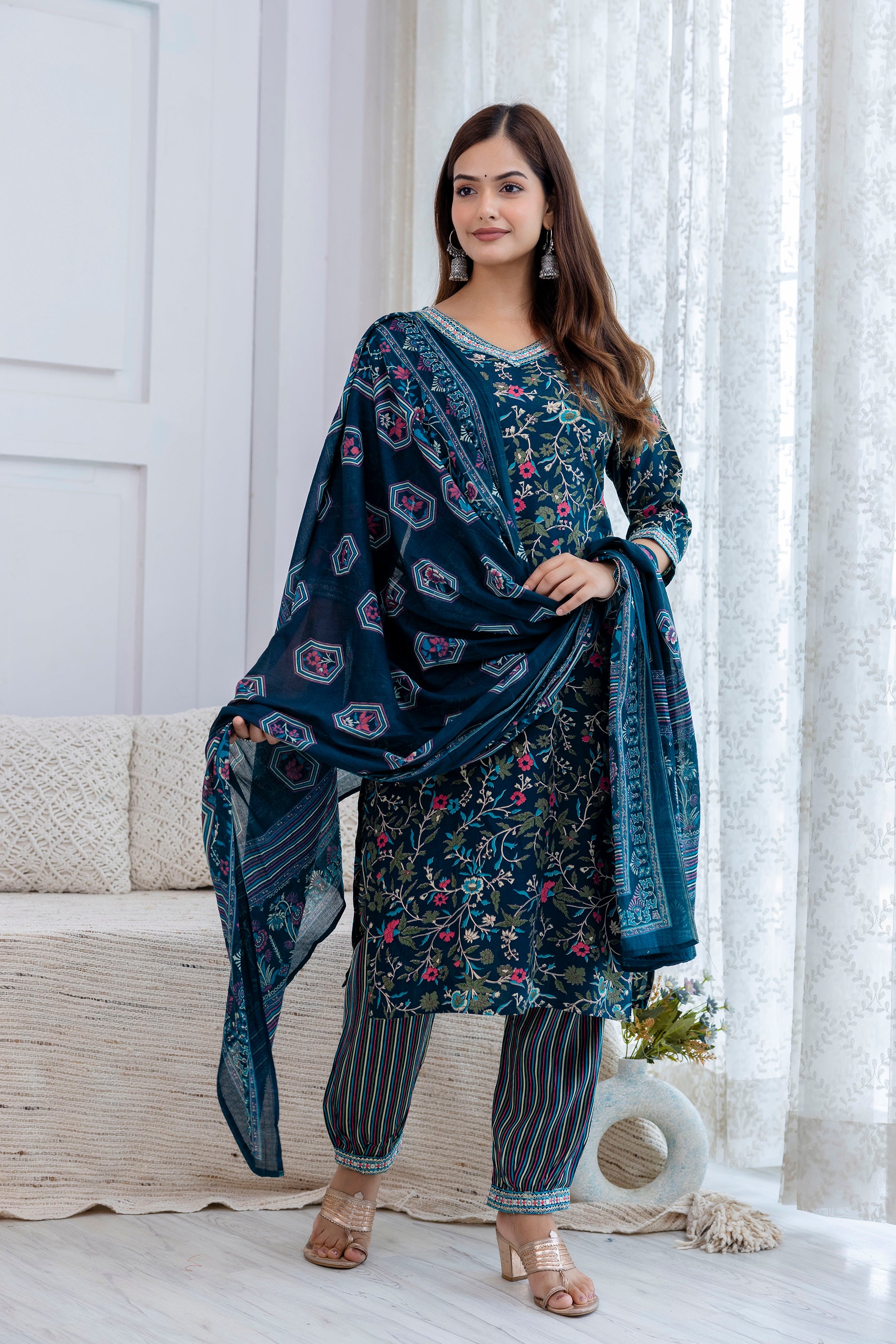 • Complete Ethnic Set: Includes a printed kurta, matching pants, and a coordinated dupatta for a ready-to-wear look.