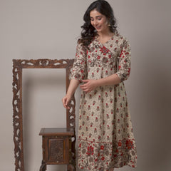 Women's Pure Cotton Floral Print Cream Maxi Dress