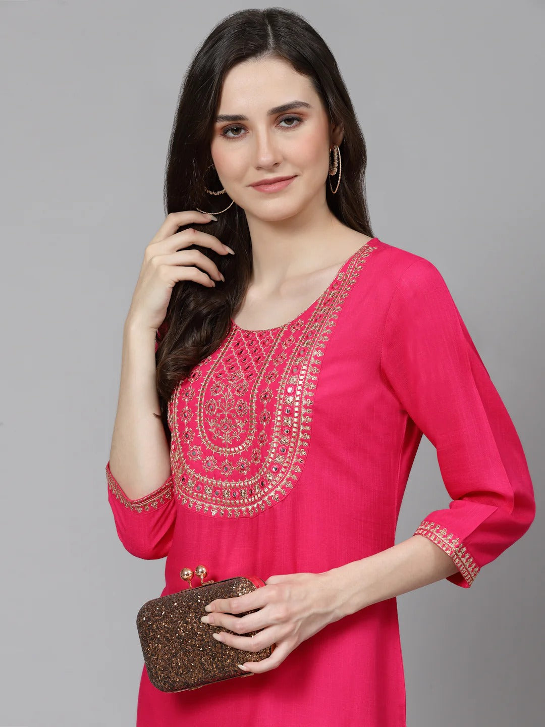 Women’s Pink Embroidered 3/4 Sleeve Ethnic Wear Straight Kurta